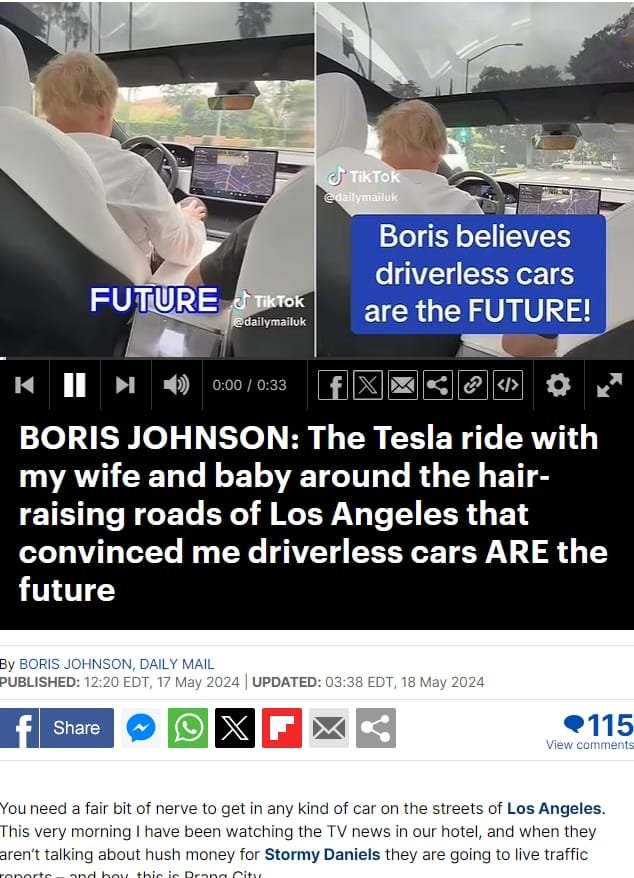 2️⃣ Former UK Prime Minister Boris Johnson penned an article in the Daily Mail about his positive experience with Tesla’s self-driving capabilities, even on LA’s crazy roads! This is a major endorsement from a world leader.